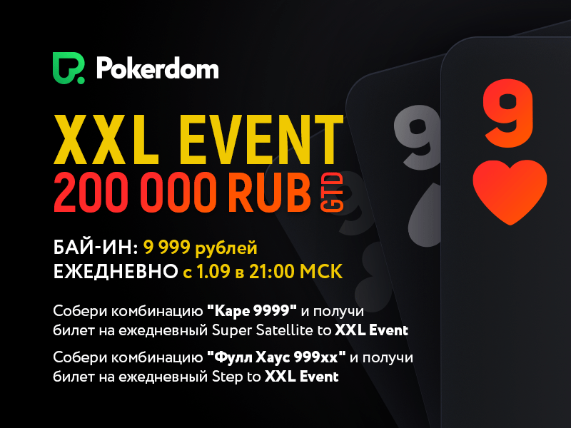 Каждый день в 21.00 в покер руме проводится турнир XXL Event, гарантия в котором составляет 200 тысяч рублей.