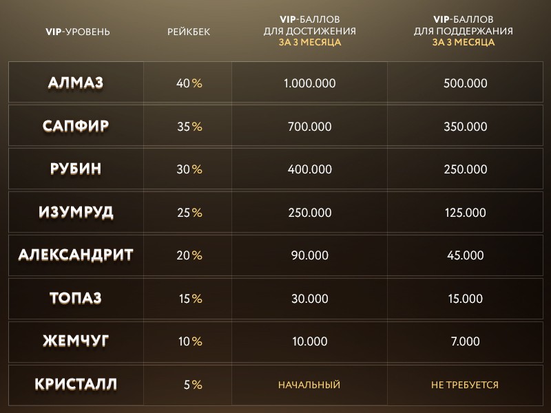 - Александрит. Получать возврат по рейку в размере 20% могут игроки, которые достигли данной ступени, собрав 90 000 очков. Для удержания позиции нужно наиграть 45 000 поинтов.